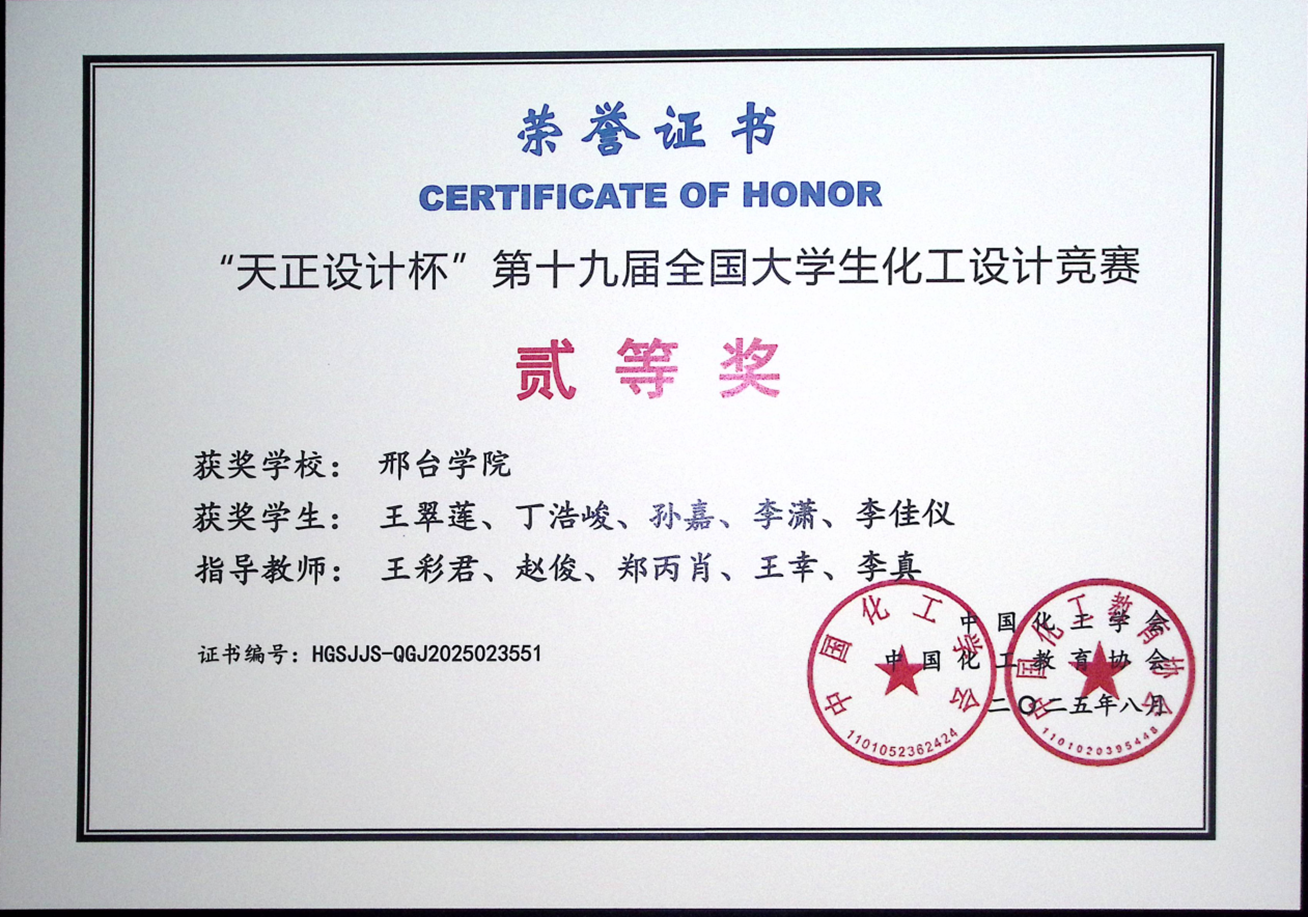 近日,由中国化工学会与中国化工教育协会联合主办的2025年“天正设计杯”第十九届全国大学生化工设计竞赛圆满落幕。我校化学工程与生物技术学院学生王翠莲、丁浩峻、孙嘉、李潇、李佳仪五位同学组成的“晓则又沐砜”团队,在王彩君等教师团队的悉心指导下,从全国479所高校的4337支队伍中脱颖而出,荣获全国总决赛二等奖。充分展现了我校学子扎实的专业功底与卓越的工程实践能力。