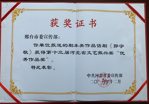 话剧《郭守敬》剧本是戏剧影视艺术系陈志良承担的横向课题“创排大型话剧《郭守敬》”(课题编号:XYH1609)科研成果,2018年荣获河北省第十三届文艺振兴奖,得到省委宣传部和市委宣传部的高度重视,认为该剧应该进一步深入调研和加工,并培育科研新项目。