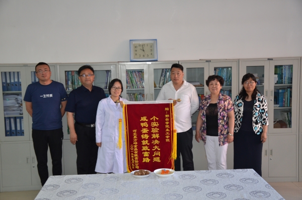 5月22日,邢台学院生物实验中心,一面绣着“小实验解决大问题,咸鸭蛋铸就幸福路”的锦旗被送到了生工学院食品科学与工程教研室乔颍鑫老师的手中。送旗的是河北泉方峪食品有限责任公司总经理王成。