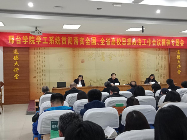 为深入学习贯彻党的十九大精神和习近平新时代中国特色社会主义思想,落实习近平总书记在全国高校思想政治工作会议上的重要讲话精神和全国全省高校思想政治工作会议精神,3月19日下午,在图书馆报告厅学工系统组织召开专题会,进一步进行安排部署。校党委书记李相佑、党委常委徐惠敏,院(系部)党委总支书记、副书记、学生管理办公室主任、团委(总支)书记、全体辅导员和团委学生处工作人员等参加了会议。