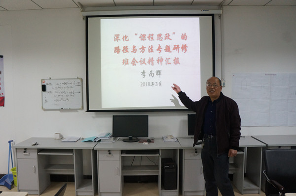 按照工作要求,认真做好培训分享。在4月9日资环学院例会上,参训教师李丙辉为资环学院全体教师作了题为“从思政课程到课程思政”的专题讲座,重点讨论了课程思政的路径、方法、...