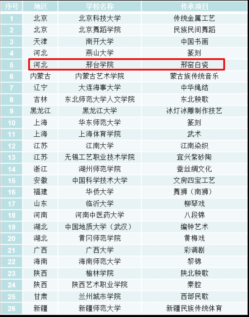 9月25日,接《教育部办公厅关于公布2020年全国普通高校中华优秀传统文化传承基地名单的通知》,我校申报的“邢窑白瓷”文化传承项目成功获批。经过自主申报、省教育厅推荐、专家遴选等环节,2020年教育部共认定26个基地为全国普通高校中华优秀传统文化传承基地,我校“邢窑白瓷”文化传承项目成功入围,这是我校推动中华优秀传统文化传承创新工作取得的标志性成果。